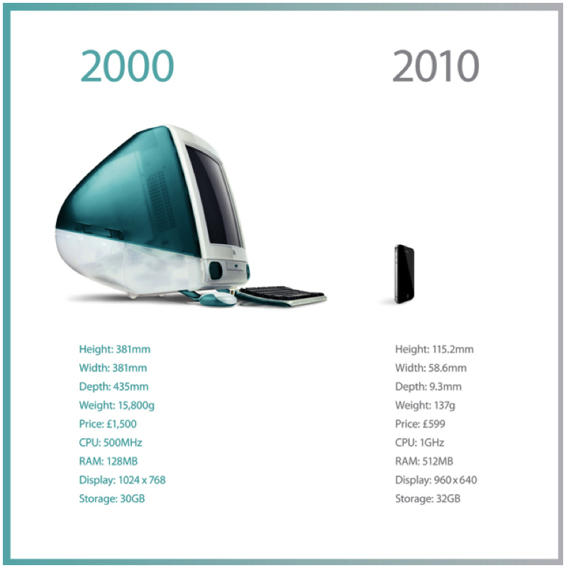 De l’iMac à l’iPhone, par Brett Jordan. En sachant que — de fait — mon iPad est plus puissant que mon PC de 2000 (Pentium III 866 MHz, 320 Mo de RAM, 10 Go de disque dur, GeForce 2 GTS et écran 15 pouces en 1 024 x 768).