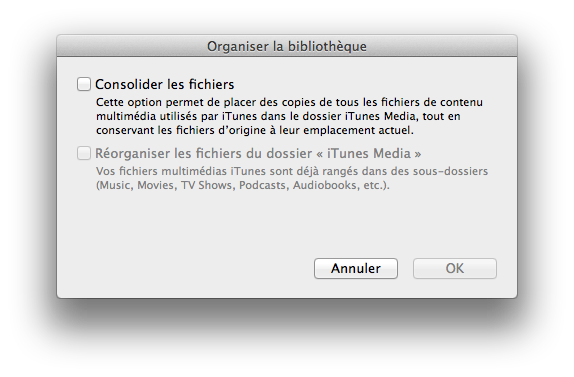 Hummm, DD externe connecté, et l’option consolider ne fonctionne pas… iTunes voudrais importer tous les fichiers musique du DD vers l’ordi. C’est l’inverse que je veux faire… Bon, je me suis débrouillée à la main, mais c’est bizarre, non ?