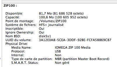 Pour tester rapidement, j’ai utilisé un lecteur ZIP 100 Mo d’origine Apple, issu d’un Power Mac G3. C’est un modèle IDE que j’ai placé dans un boîtier USB destiné à l’origine à un disque dur. Ca fonctionne parfaitement, Mac OS X voit le lecteur ZIP et il est utilisable. Et quand on éjecte le lecteur, le disque est bien éjecté physiquement.