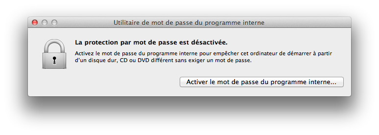 Si Apple propose de mettre un mot de passe firmware, qui empêche notamment de démarrer sur une partition autre que la principale sans le mot de passe, il y a un petit souci : il faut démarrer sur un DVD d’installation ou la partition de restauration. C’est un problème dans certains. Heureusement, il est possible de le faire depuis un Mac OS X lancé, sans redémarrer.