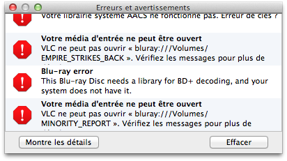 Voici deux de mes messages d’erreurs classiques. Le premier parce que mes clés ne sont pas récentes (avril 2012), le second parce que le Blu-ray utilise BD+, pas encore supporté.