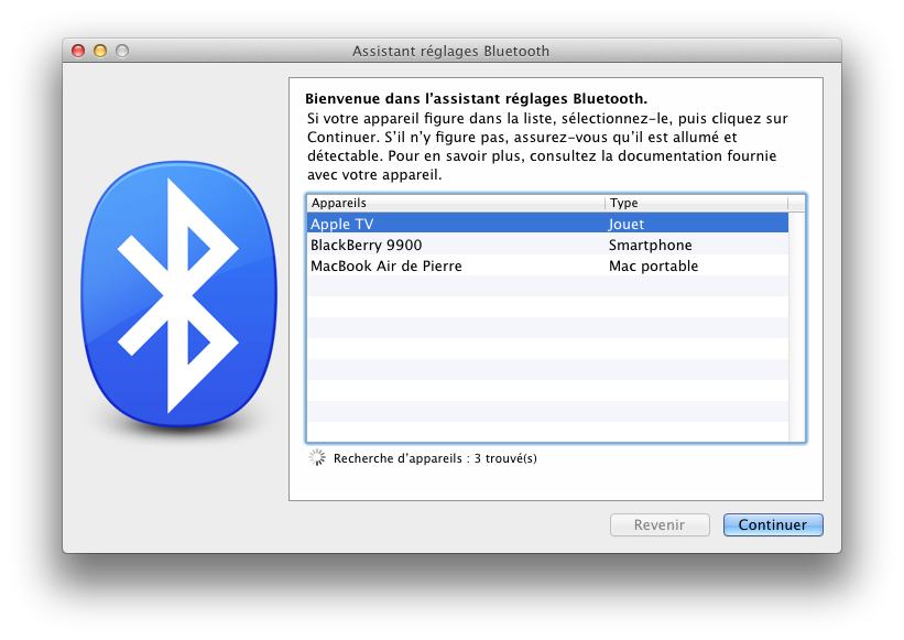 Le dernier truc, un peu bizarre, c’est que l’Apple TV est vu en Bluetooth depuis un autre appareil. Mac OS X me classe l’appareil dans audio/jouet et le jumelage ne fonctionne pas correctement, l’Apple TV n’affiche pas le code à l’écran.