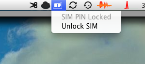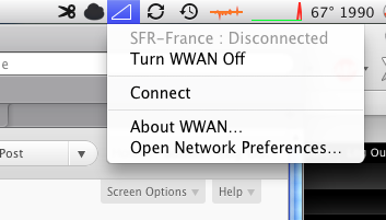 Une fois la carte branchée — ici une Novatel Merlin XU870 en ExpressCard — Mac OS X affiche le triangle classique présent sur tous les téléphones, avec les barres indiquant la qualité de la réception. Quand on clique dessus, il affiche (en anglais, malgré un système en français) le réseau (ici avec une SIM SFR désactivée), la possibilité de couper la carte, la possibilité de connecter la carte à Internet ainsi que quelques informations sur le modem.