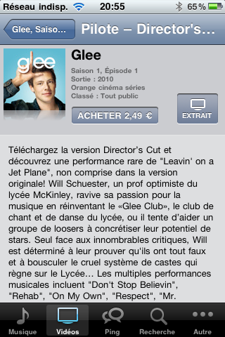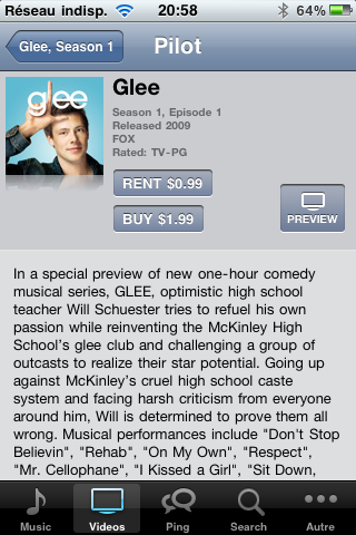Autre nouveauté de l’iOS 4.1, la location de série. Bon, avec un compte français, ça ne marche pas. Avec un compte américain, pas de problèmes, on a le choix de la location (1 $) ou l’achat (2 $). Au passage, la même série passe à 2,5 € en France….