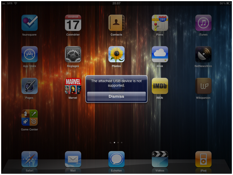 Autre petite fonction bienvenue, brancher un iPhone via son câble 30 broches est parfaitement possible, c’est intéressant pour récupérer les photos directement sur l’iPad.
