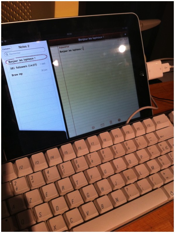 Autre petite astuce, il est possible de se passer du clavier Bluetooth ou du clavier pour iPad, en branchant simplement un clavier USB à l’appareil. Ca fonctionne avec un ancien clavier Apple (comme sur la photo), avec la majorité des claviers USB PC (même si les raccourcis sautent) mais pas avec le clavier aluminium Apple (le hub USB nécessite trop d’énergie).