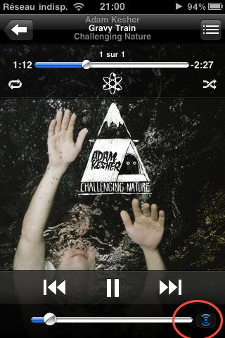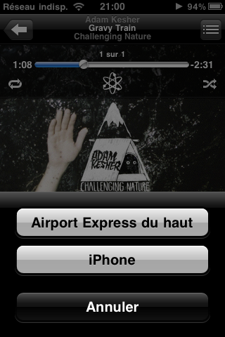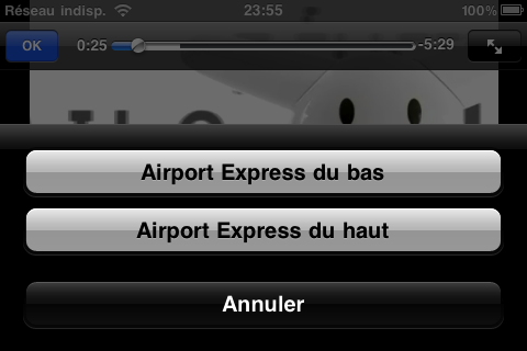 Nouveauté la plus marquante d’iOS 4.2, AirPlay. Cette fonction s’active quand une enceinte compatible est détectée, actuellement une borne AirPort Express, et permet de streamer le son en Wi-Fi.