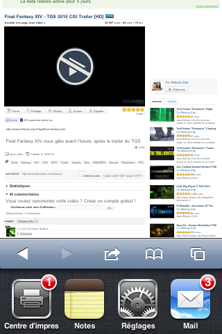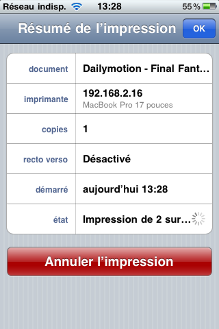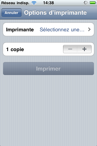 Dans iOS 4.2, une des nouveautés, c’est AirPrint. Et si vous avez un ordinateur compatible (il faut notamment Mac OS X 10.6.5), il est possible de partager une imprimante pour que l’iPhone (ou l’iPad) puisse imprimer. Bon, le concept est bizarre, j’ai dû partager une imprimante réseau (sic) pour que ça fonctionne, mais voilà. Le test d’iOS 4.2 sur iPhone 3GS a été mis à jour.