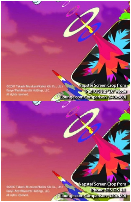 Bonne nouvelle, les applications iPhone peuvent maintenant utiliser en partie l’écran haute définition de l’iPad. En effet, certaines applications, comme Napster (je n’ai pas pu tester, faute d’habiter aux États-Unis) sont capables de garder une image propre, même en émulation sur iPad.