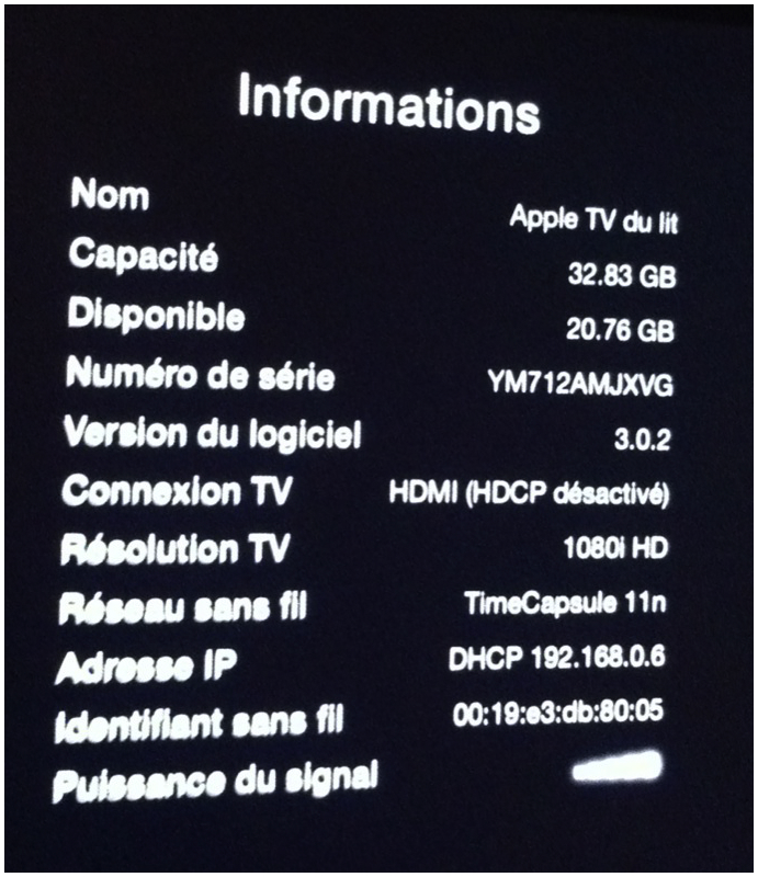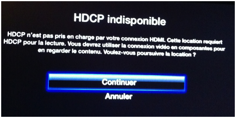 Sauf que j’ai voulu louer un film sur l’Apple TV (le film de la semaine). Et là, message : HDCP indisponible, alors que c’est obligatoire. Déjà, mon écran et l’Apple TV sont HDCP, et ensuite en quoi c’est obligatoire ?