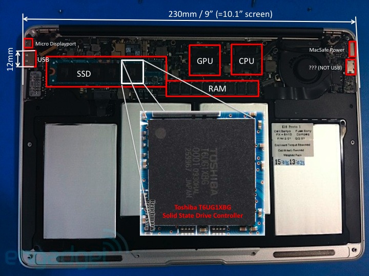 La machine abandonnerait le disque dur pour un SSD, dans un format propriétaire. Le contrôleur utilisé serait le Toshiba Daikoku, que l’on retrouve dans les Mac depuis un moment. Comme sur le premier, un connectique anémique : un port USB, un connecteur Mini DisplayPort, un connecteur MagSafe et a priori un emplacement pour une Micro SIM (ce qui implique un modem 3G interne).