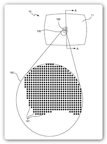 Apple a déposé un brevet intéressant : il permet de faire totalement disparaître la Pomme quand le Mac est éteint. L’idée est de ne plus proposer une Pomme transparente sur la coque comme actuellement (c’est une simple fenêtre sur le rétroéclairage) mais de micrograver des trous dans la coque en aluminium, pour laisser passer la lumière quand l’écran est allumé. C’est plus discret qu’actuellement et déjà utilisé pour la LED de veille ou pour celle de la webcam, même si ce n’est pas invisible. A voir, donc.