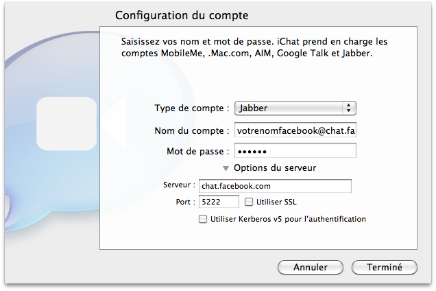 Ajoutez ensuite dans les Options du serveur le serveur chat.facebook.com, sur le port 5222 et sans le SSL.
