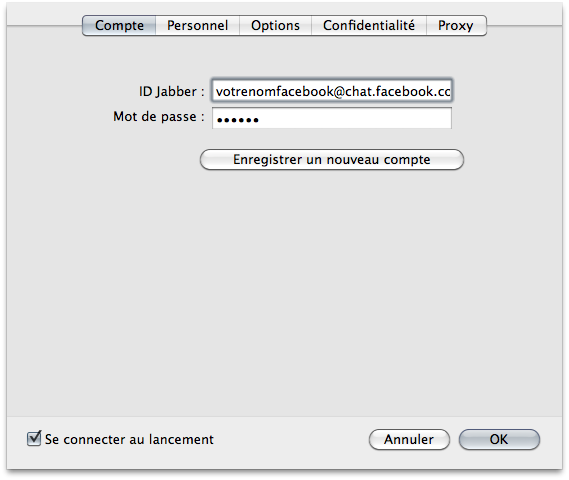 Il faut aller dans les Préférences, onglet Compte et ajouter un compte Jabber (avec le petit +). Comme sur iChat, les paramètres sont simples : votrenomraccourciFacebook@chat.facebook.com en login, votre mot de passe Facebook en mot de passe. Et c’est tout.