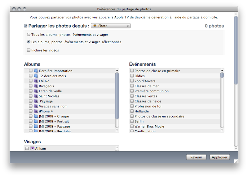 Pour les photos, il est maintenant possible de gérer correctement les photos partagées avec l’Apple TV de seconde génération, en choisissant notamment les événements à partager, quand on utilise iPhoto. Attention, alors que c’est dans les préférences d’appareils avec l’Apple TV de première génération, ici il faut aller dans Avancé -> Choisir les photos à partager…. Ensuite, on règle ce que l’appareil peut voir.