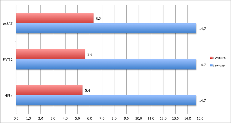 Les résultats sont en Mo/s, sur une clé pas forcément rapide, le tout testé sur un Mac mini 2010. Comme on le voit, exFAT est rapide…