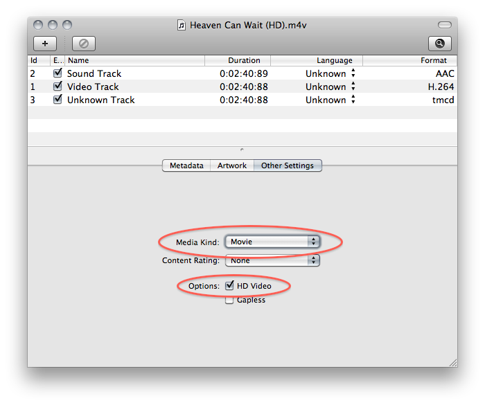 Seconde étape, tagger le fichier HD. Dans Subler, ouvrir le fichier, dans Other settings, choisir Movie dans Media kind et cocher la case HD Video, du moins si c’est un film, ça peut aussi être une série TV ou un clip vidéo.
