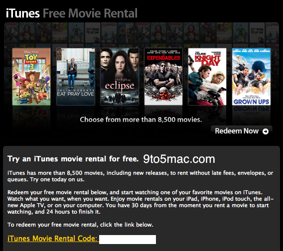 Selon 9to5Mac, Apple offre des locations de films gratuitement à certains utilisateurs, a priori pour tester le service. C’est uniquement aux Etats-Unis, c’est semble-t-il assez aléatoire (je n’ai rien reçu sur mon compte US, dommage) et il n’y a pas de raison officielle.