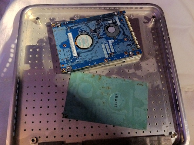 Aujourd’hui, une petite modification. J’ai un Apple TV de la première génération, doté d’un disque dur de (seulement) 40 Go qui commençait à se faire vieux. En plus d’être assez lent, le disque dur Fujitsu de 40 Go est assez bruyant, surtout lors des accès. Et impossible de laisser l’Apple TV allumé une fois un film regardé, on entend distinctement le disque souffler. Comment régler le problème ? Mettre un SSD est la première idée, mais les SSD en PATA, c’est rare et plutôt cher, 100 € le 40 Go. La seconde solution, choisie, c’est de mettre un disque dur qui fait moins de bruit. Et j’ai donc installé un modèle 1,8 pouce de 60 Go dans l’Apple TV. Il ne provient pas d’un iPod, mais d’un netbook…