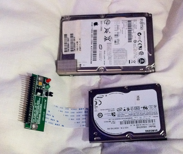 Comme on le voit, la différence de taille entre les deux disques durs est conséquente. On voit aussi l’adaptateur permettant de passer du ZIF au connecteur PATA classique.