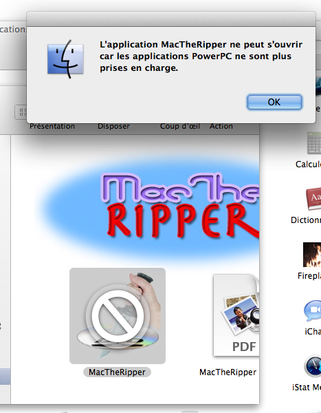 Un peu d’infos sur Mac OS X Lion, qui signe la véritable fin des PowerPC. Si de plus en plus de programmes n’existent plus en version PowerPC et que Snow Leopard ne fonctionne que sur Intel, il était toujours possible de lancer les programmes via Rosetta, l’émulateur (plus ou moins) optionnel présents dans Snow Leopard. Mais avec Lion, niet. Plus de Rosetta. Plus de programmes PowerPC. Et un message assez explicite. C’est les amateurs d’Office 2004 qui vont râler…