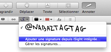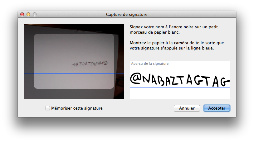 Mac OS X Lion intègre une nouveauté intéressante, la signature. Le système permet de créer une signature à intégrer comme annotation dans les PDF (notamment), via Aperçu. C’est assez simple : on écrit la signature au stylo noir sur une feuille de papier, on passe le tout devant la webcam du Mac (désolé pour les utilisateurs de Mac mini et Mac Pro) et Mac OS X interprète le tout. C’est efficace, pratique, et ça peut servir.