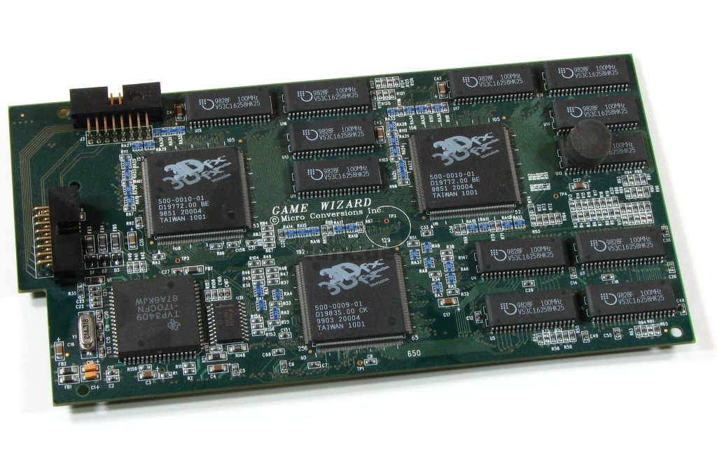 Je suis tombé sur un truc : le premier iMac (le Bondi Blue) pouvait accepter une carte d’extension, via un port mezzanine. Ce connecteur, reliquat du développement, est essentiellement un connecteur PCI sous une forme atypique et certains constructeurs en ont donc profité, avec des cartes SCSI, des tuners TV ou… une Voodoo 2.