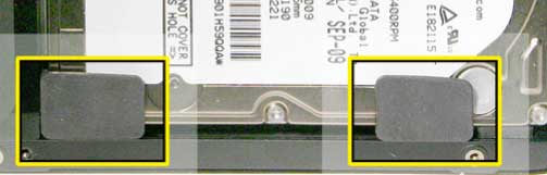 Intéressant : Apple a modifié le système de fixation interne des MacBook, pour mieux protéger le disque dur et a priori limiter les vibrations. D’un simple système de vis, on passe à des « silent block » en caoutchouc qui pincent le disque dur. On peut espérer que les disques durs 7 200 tpm vibreront moins avec ce système…