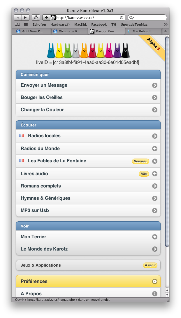 Karotz Kontroller est une application web compatible avec la majorité des navigateurs et des téléphones et elle permet de contrôler certaines fonctions de Karotz. Plutôt efficace, l’application souffre des mêmes défauts que l’application iPhone, comme l’impossibilité de lire des fichiers audio si des accents sont présents dans le nom ou les tags.