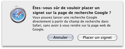 Apple pense à tout, même dans Safari. Quand on essaye de mettre Google en signet, un joli message apparaît et explique qu’il est possible de faire une recherche directement dans un champ dédié, près de la barre d’adresse. C’est un peu prendre les utilisateurs pour des débiles, mais c’est amusant.