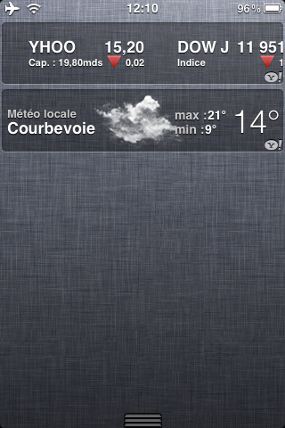 Dans iOS 5, la zone de notifications est un panneau qui contient — en plus des notifications — deux widgets, un pour la bourse et un pour la météo (géolocalisée). Et visiblement, même si Apple ne le documente pas réellement, il est possible de créer des widgets compatibles. Pour le moment, c’est uniquement compatible iPhone. Espérons qu’Apple ouvre cette zone aux développeurs, ça pourrait être intéressant.