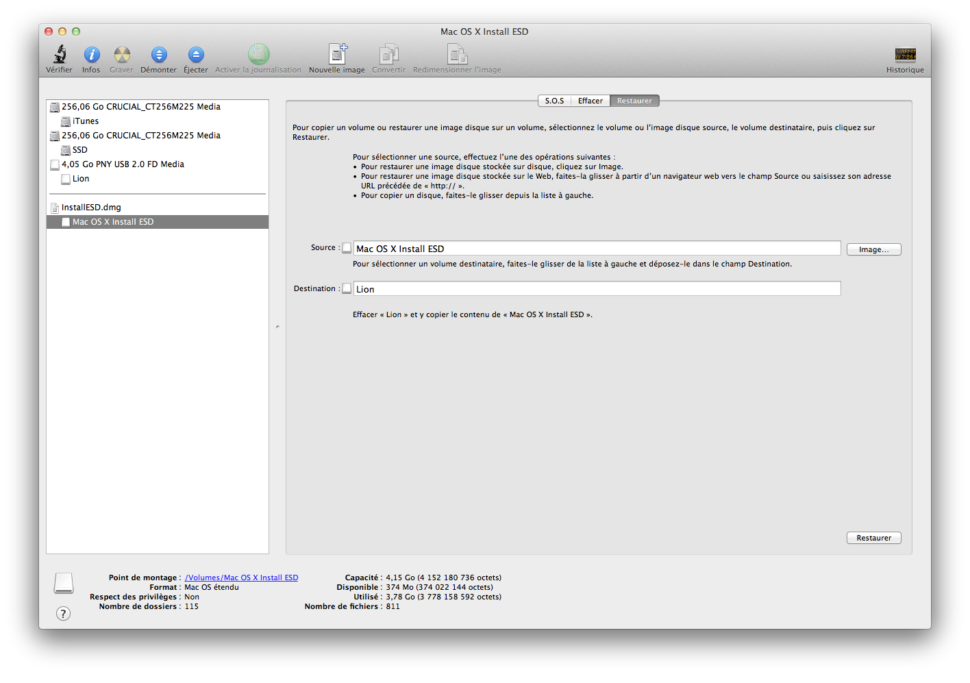 Une fois ouvert, il suffit de se rendre dans Utilitaire de disque, sélectionner InstallESD.dmg et choisir restaurer. Comme source, on prend l’image en question, comme destination la partition sur la clé USB (ici Lion). On clique sur Restaurer et on attend, en fonction de la vitesse de la clé USB. Et voilà.