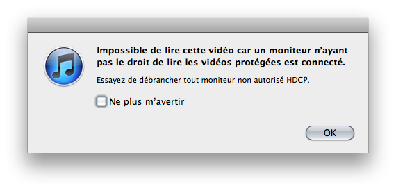 Apple, vous le savez peut-être, protège ses vidéos HD (en 720p) avec la technologie HDCP, qui empêche la lecture si un des éléments n’est pas compatible. Un des éléments, c’est l’ordinateur, le câble ou l’écran. Et en HDCP, il faut être en numérique, donc pas en VGA, par exemple. C’est un problème dans le sens où les écrans DVI Apple ne sont pas compatibles HDCP…