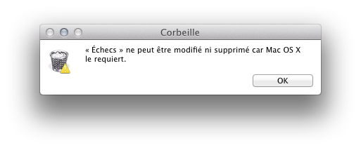 Marrant : dans Mac OS X Lion, si on essaye de supprimer un programme Apple comme Safari, iTunes ou le jeu d’échec, le système prévient que c’est impossible. Parce que bon, le jeu d’échecs de Mac OS X est évidemment indispensable pour le système…