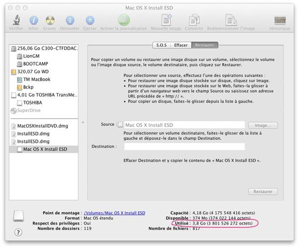 Petite subtilité par rapport à mon billet sur Lion et les clés USB : Apple a décidé de nous embêter de façon mesquine. En effet, le fichier à restaurer fait 4,18 Go, ce qui empêche de le restaurer sur une clé de 4 Go et nécessite une clé de 8 Go. Sauf que l’image fait réellement 3,8 Go et contient en fait 400 Mo d’espace libre… Si ce n’est pas une tentative délibérée d’embêter les gens…