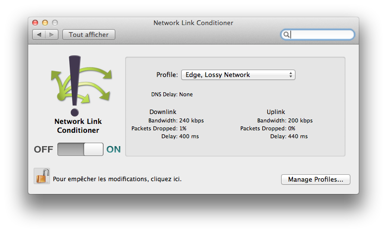 Le programme se trouve dans /Applications/Utilitaires/Network Link Conditioner/Network Link Conditioner.prefPane. Il suffit de le lancer pour qu’il s’installe. Ensuite, on va dans les Préférences Système, on clique sur le cadenas et on choisit le type de réseau à simuler.