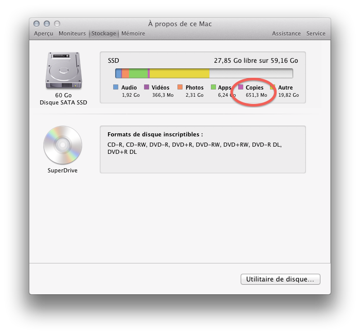 Point intéressant, c’est totalement transparent. En fait, vous verrez dans A propos de ce Mac -> Informations -> Stockage qu’une partie du disque est réservée au copie (Backup en anglais) mais le Finder considère que cet espace est disponible : en cas de besoin, les données seront effacées.