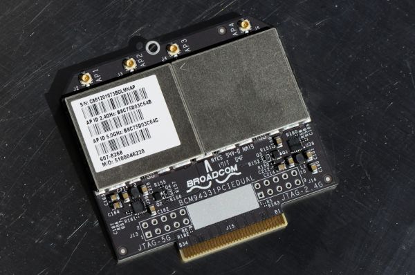Deux puces ? Oui, depuis quelques années les bornes Apple sont dual band et travaillent donc en 2,4 GHz et en 5 GHz simultanément. Et pour faire ça, il faut deux cartes Wi-Fi. Enfin, plus exactement une carte qui contient deux contrôleurs Wi-Fi, ici du Broadcom. Entre les AirPor Extreme Gen4 et les AirPort Extreme Gen5, la carte mère ne bouge pas mais la carte Wi-Fi a donc été modifiée.