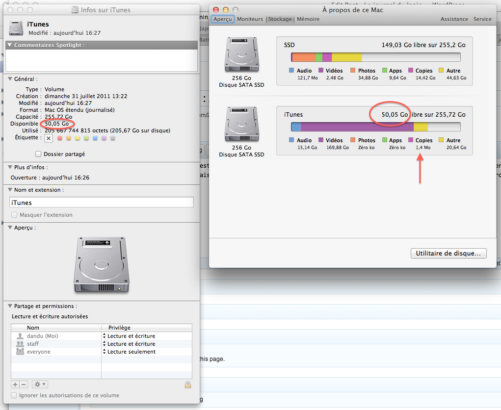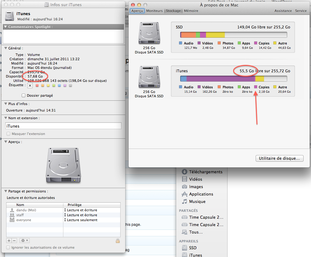 Une des nouveautés de Lion, c’est les sauvegardes Time Machine en local. C’est assez pratique pour récupérer rapidement un fichier effacé, vu qu’on lit depuis le disque dur interne, mais ça prend de la place. Enfin, et c’est à mon sens un erreur d’Apple, ça semble prendre de la place.