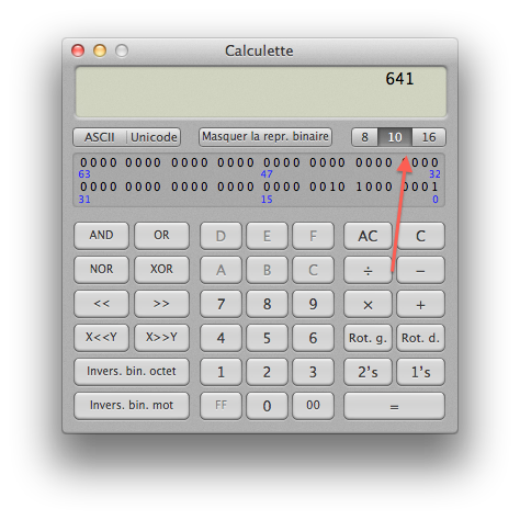 Pour mon lecteur, on a donc 0x054c pour le fournisseur (Sony) et 0x0281 pour le produit. Valeur qu’on va devoir convertir en décimal. Comme je pense que vous n’êtes pas tous familiers avec les conversions de l’hexadécimal au décimal, on va passer par la calculatrice de Mac OS X. Il faut passer en mode Programmeur dans les menus, cliquer sur la petite icône 16, entrer la valeur et ensuite cliquer sur le petit 10. 0x0281 devient 641 et 0x054c devient 1356.