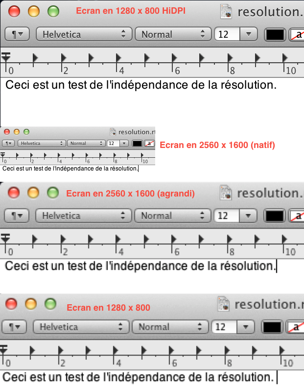 Aujourd’hui, je vais vous parler de l’indépendance de la résolution. Pour ceux qui ne connaissent pas le concept (c’est normal), j’ai publié ce matin un article sur le sujet sur Tom’s Hardware. Et j’ai pas mal utilisé Mac OS X pour mes tests, pour une bonne raison : Apple maîtrise assez bien le sujet avec iOS (et l’iPhone 4) et OS X Lion prend en charge l’indépendance de la résolution en partie, comme le montre le test.