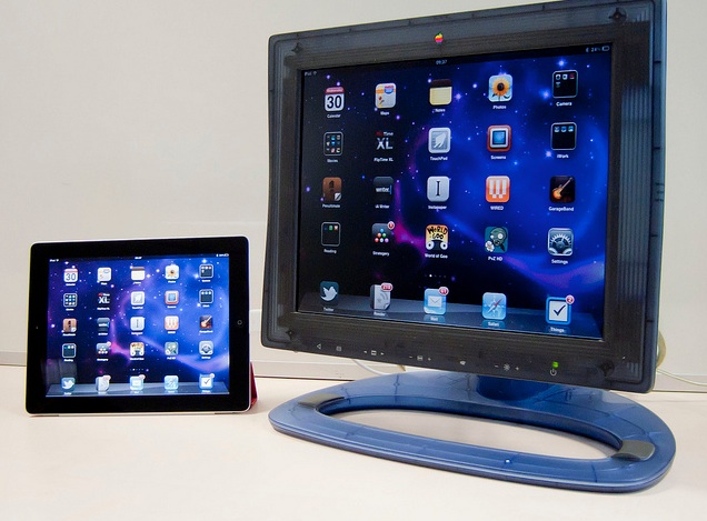 Jolie photo trouvée hier sur FlickR : un iPad 2 en mode miroir sur un écran Studio Display de première génération, un des premiers appareils transparents. C’est de l’analogique (via un adaptateur DA-15 vers VGA) mais c’est sympathique. Et l’écran en question a la même définition que l’iPad 2 : 1 024 x 768.