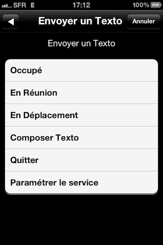 Chez SFR, ça s’appelle Illico Texto. C’est gratuit, il y a 3 messages prédéfinis et la possibilité d’en ajouter 5. C’est dépendant de la carte SIM et il en faut une récente (après 2010).
