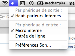 Petite astuce méconnue : il est possible de changer rapidement de source audio avec Mac OS X. Il suffit en fait de cliquer sur l’icône de haut-parleur en pressant option (alt) en même temps. Un menu permettant de définir la sortie ou l’entrée active apparaîtra.