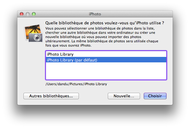 Et c’est assez simple : il suffit de lancer le programme en pressant option (alt). Un menu apparaîtra, avec la possibilité de gérer les bibliothèques rapidement. Pour déplacer une bibliothèque, il suffit de copier le fichier (iPhoto Library) ou le dossier iTunes à un autre endroit et l’indiquer à l’application.