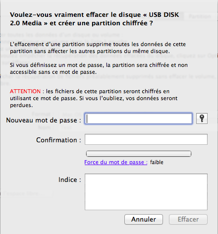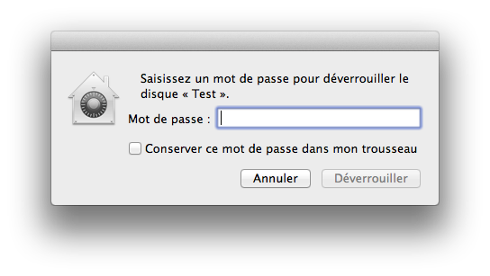 Il suffit d’ouvrir le Terminal et de taper la ligne suivante, en remplaçant [device] par le nom de votre partition (par exemple ici /Volumes/Test) et [password] par le mot de passe souhaité.