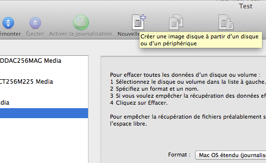 Première chose, créer une image disque. Il suffit de cliquer sur Nouvelle image dans Utilitaire de disque sans qu’un élément de la colonne de gauche soit sélectionné.