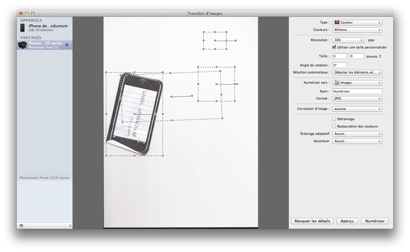 Une fois l’imprimante allumée, il suffit de lancer Transfert d’images et l’interface permettant de scanner apparaît. C’est rapide et quand même plus propre que d’installer les pilotes HP (ou dans mon cas de scanner directement sur une clé USB depuis l’écran tactile). Cerise sur le gâteau, ça fonctionne via le réseau : pas besoin de mettre un câble USB entre l’ordinateur et l’imprimante.