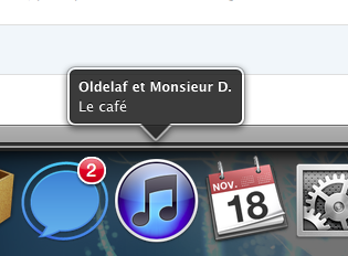 Petite astuce très sympa pour iTunes : il est possible d’afficher une notification au moment du changement de piste dans iTunes. Un peu comme avec Growl, un message apparaîtra au dessus de l’icône dans le dock au changement. Pour l’activer, il faut jouer de la ligne de commande (et penser à quitter iTunes avant). Attention, ça ne fonctionne que sous Lion.