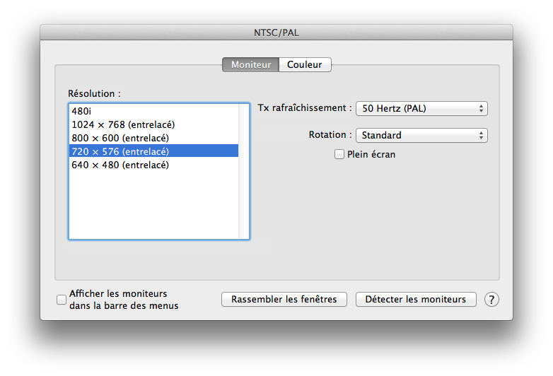 In the proposed definitions, one finds the 480i60 (720 x 480 at 60 frames / s, NTSC), the 720 x 576 at 50 Hz and three definitions of PAL 4:3 640 x 480, 800 x 600 and 1024 x 768, in all three cases interlaced. With a CRT TV, the 1024 x 768 may not appear (this is due to my test with an LCD).